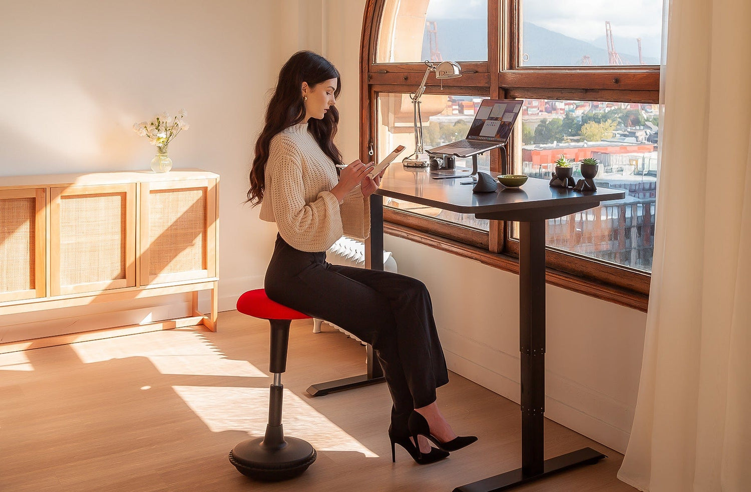 Actively sit by engaging your core to maintain balance with our standing desk stool.