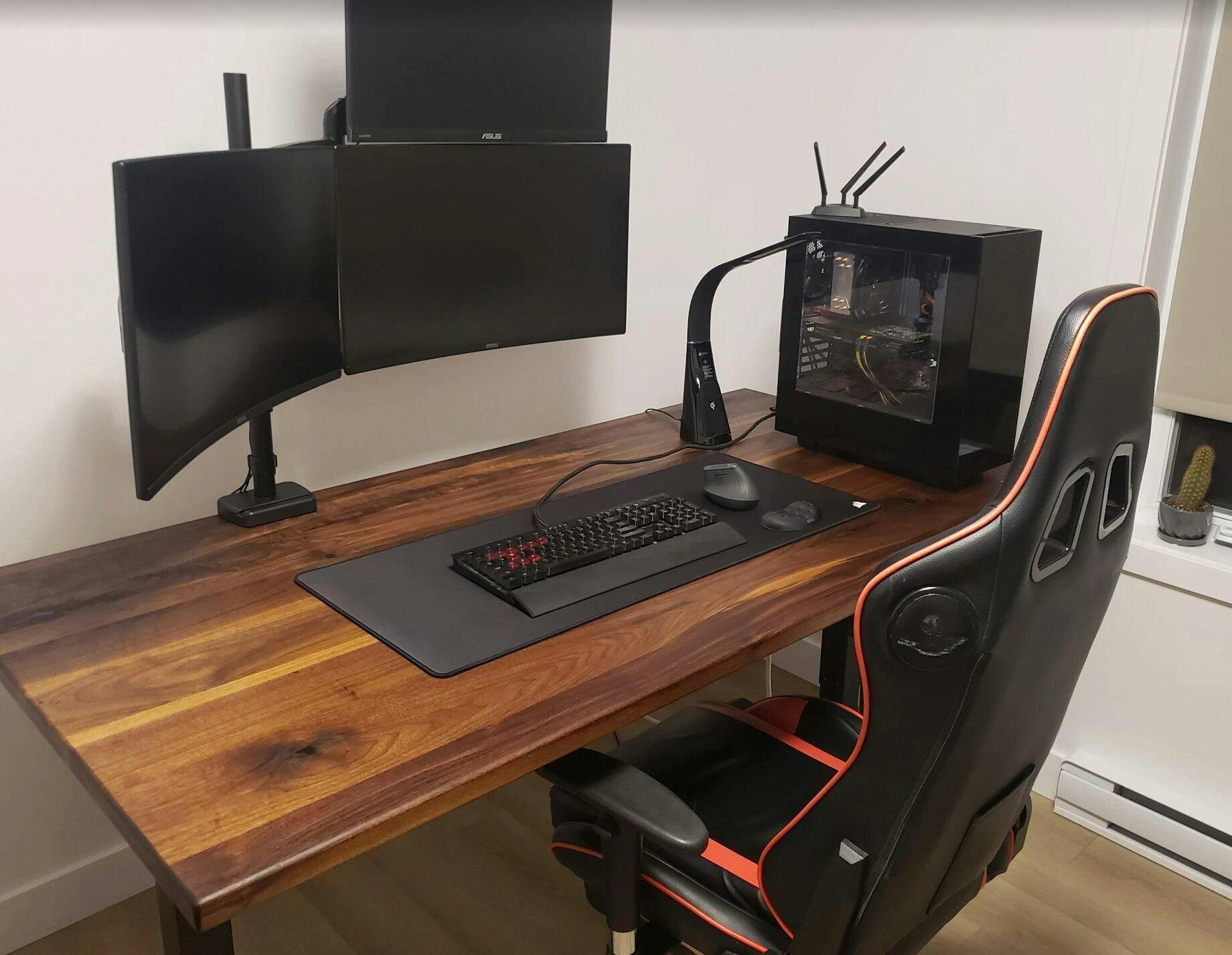 The table size was determined by what the EffyDesk frame could handle, the three monitors, and the room size, as the table was going to be the main feature of this den. I bought two Acacia butcher blocks to make a L shaped desk. I had used doweling to glue together and a lot of router work for under table, edge LED lighting, space for 4 table top stiffeners to prevent any future warping, and a railing system for flight stick mounts. I also customized with 3 cut-outs for multiple power sources and 8 cable access points. Although they do provide a nice centre cable tray, I opted for my own cable tracks at the back and sides – two different sizes to keep cables clean and organized, as I have a lot of cables for power and control routing under the desk.