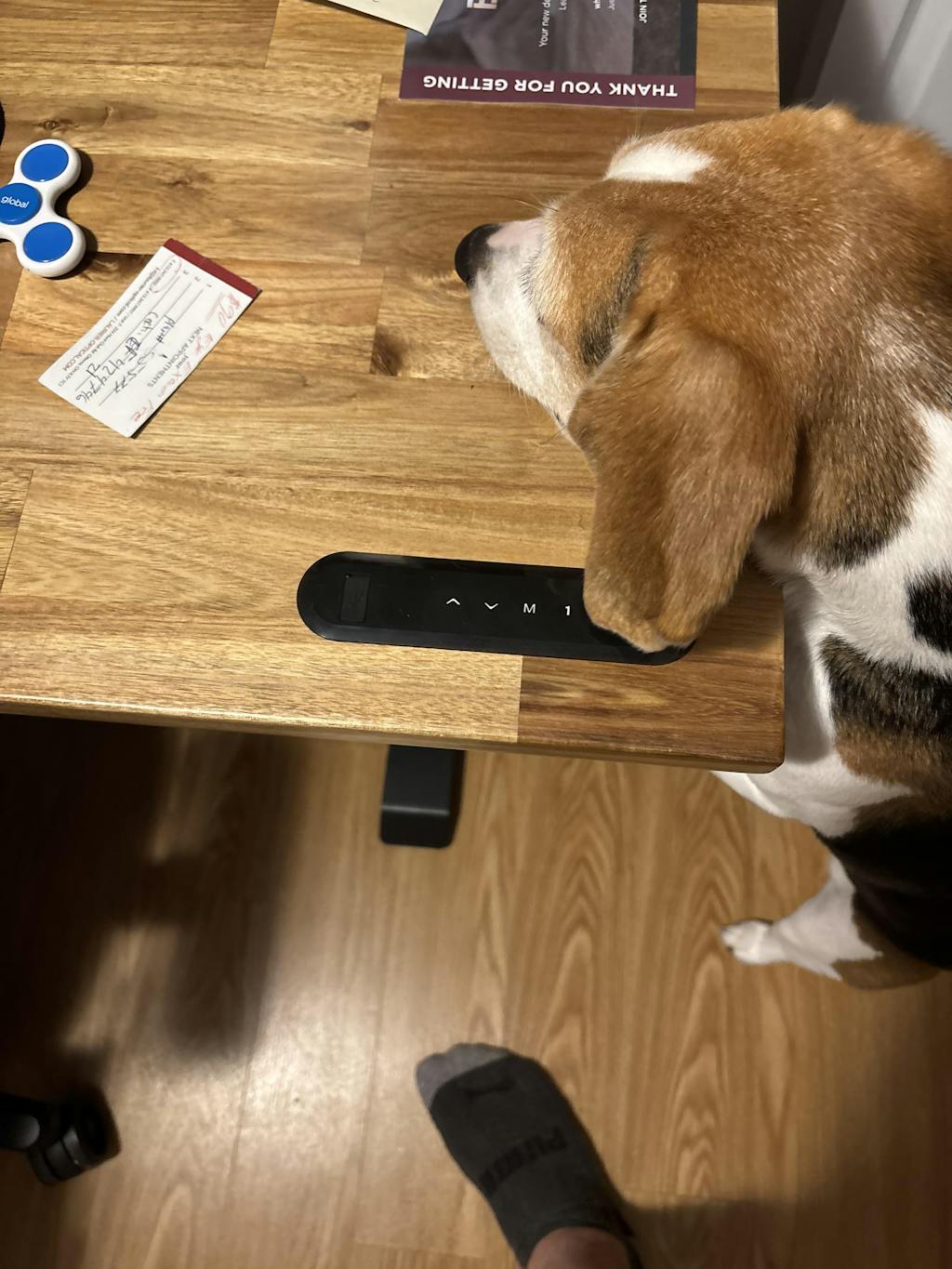 To reset, unplug and plug the desk for 15 minutes. Then press the Down button and hold for 10-15 seconds until the table stutters and beeps.
